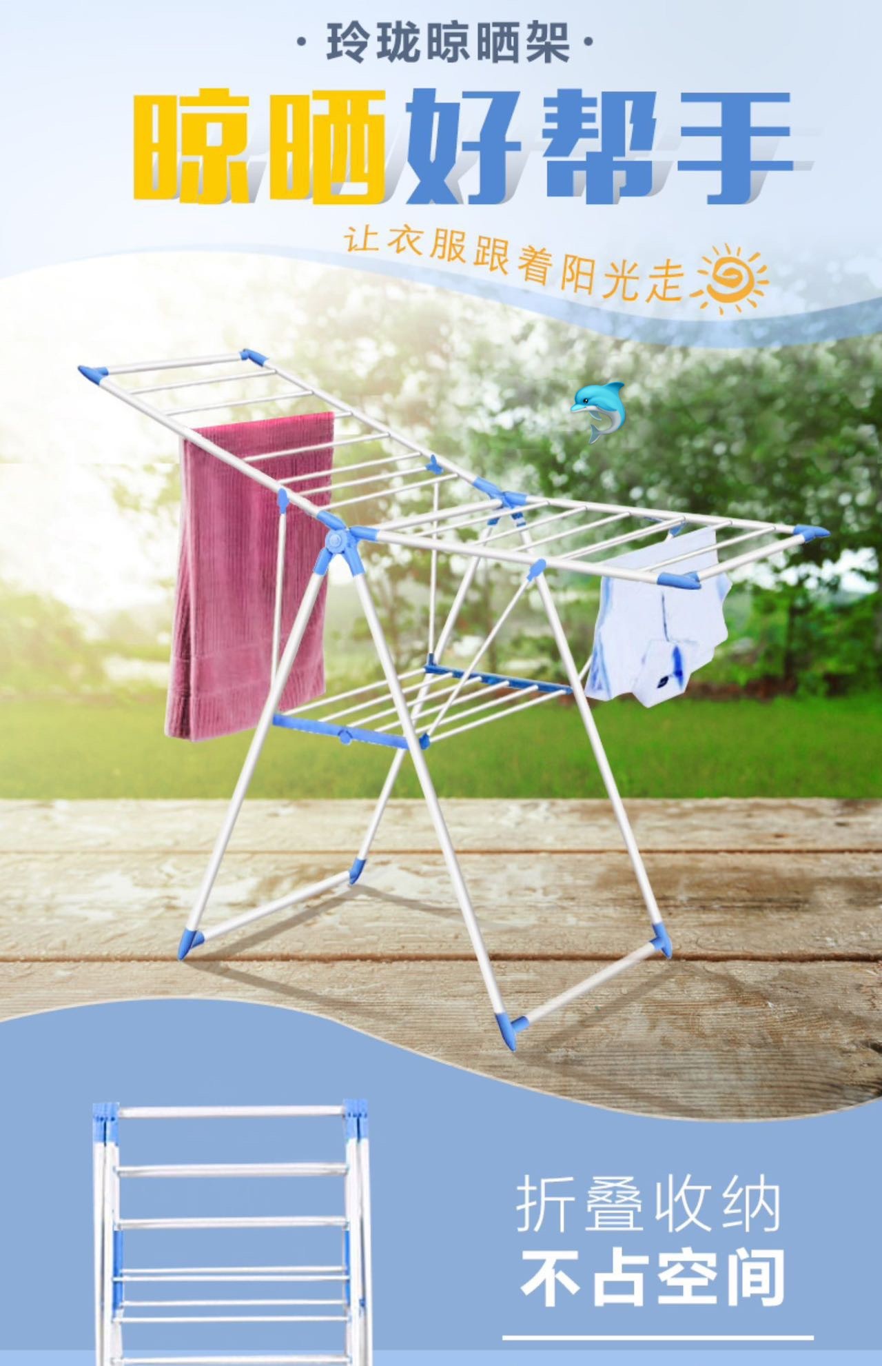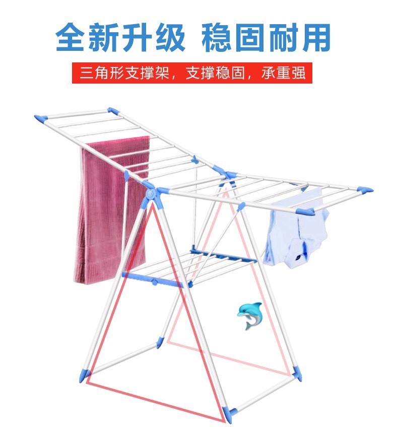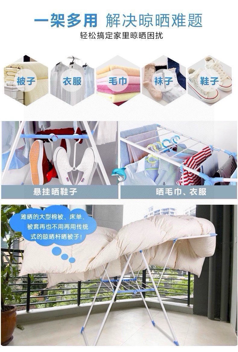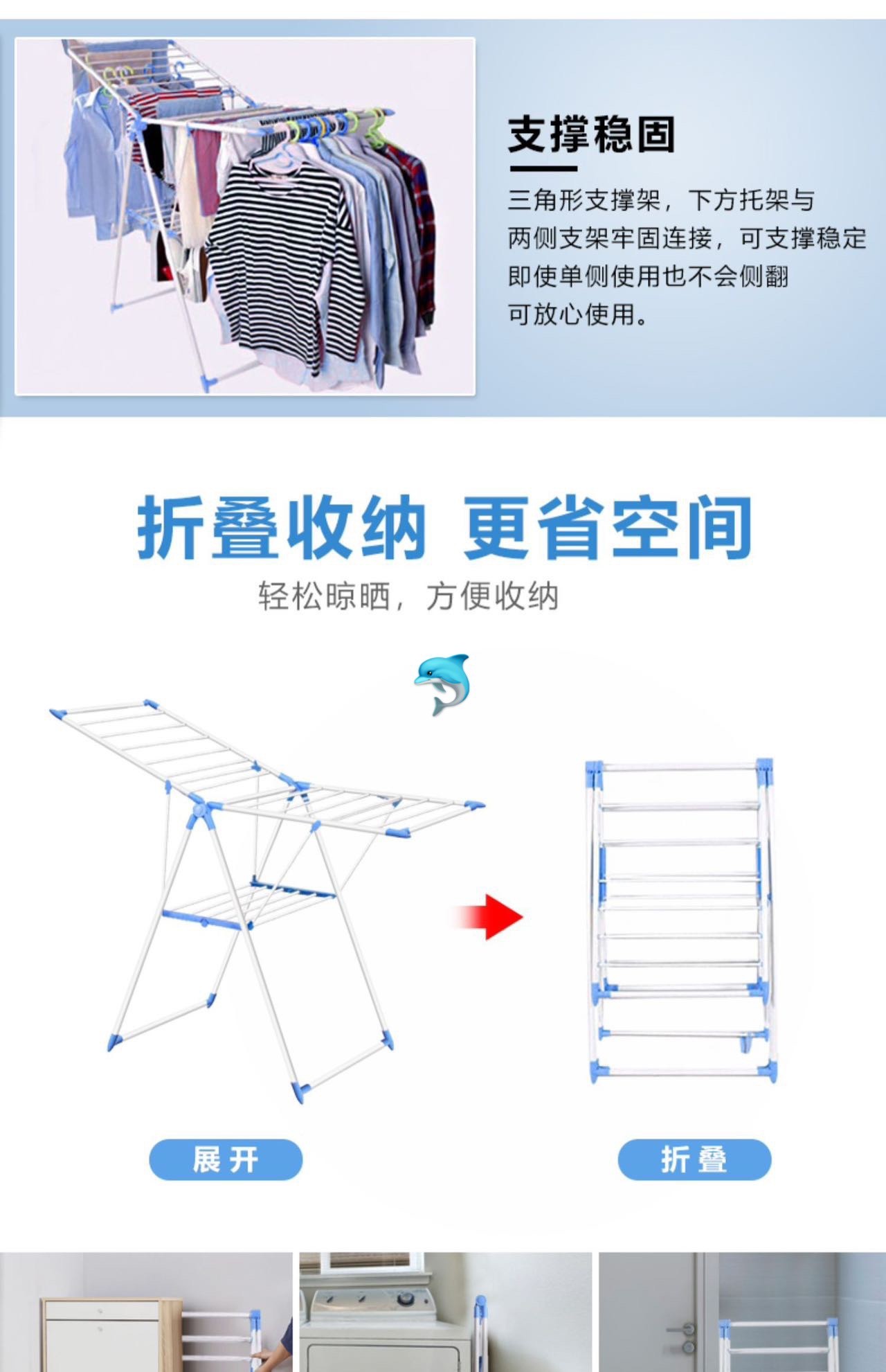 可折叠晾衣架室内外晾晒衣架🌟让衣服跟着阳光☀️走‼️一架多用,解决晾晒难题,衣服👔、棉被、裤子👖、袜子🧦、鞋子👟、通通都可以晒👍让衣服保持间距,利用通风,方便快速🔜晾干,无异味❤️全新升级,三角形支撑架,稳固耐用,承重强👍一年四季均可通用⚜️