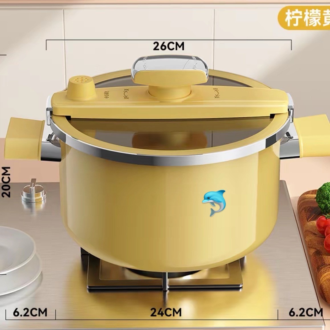 材质: 珐琅 容量: 7L 尺寸:直径:26cm 颜色: 1️⃣柠檬黄,2️⃣薄荷绿,3️⃣云朵白 锅盖: 防爆玻璃盖 类型: 微压锅 锅底: 复合底(适用各种灶台)